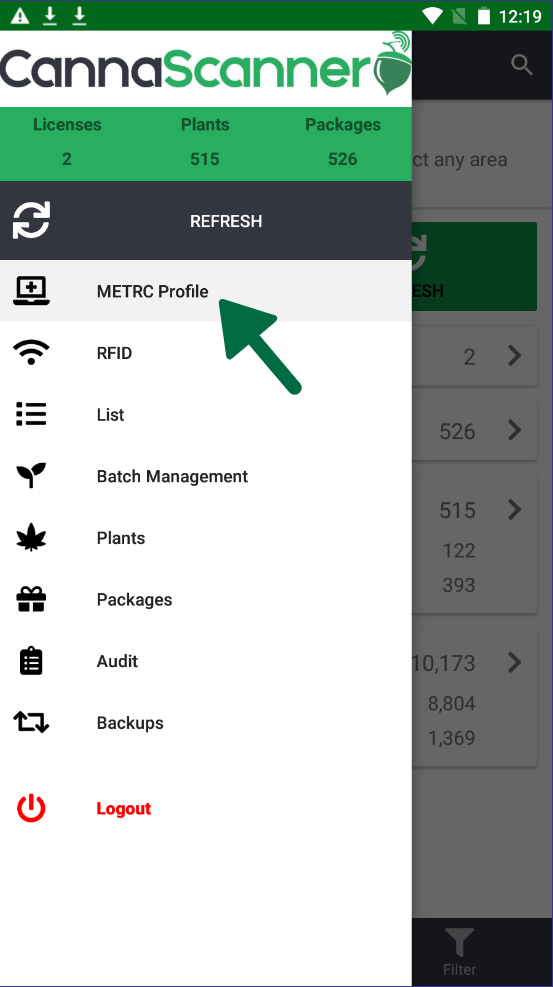 The METRC Profile tab in the main menu of your CannaScanner allows you to: