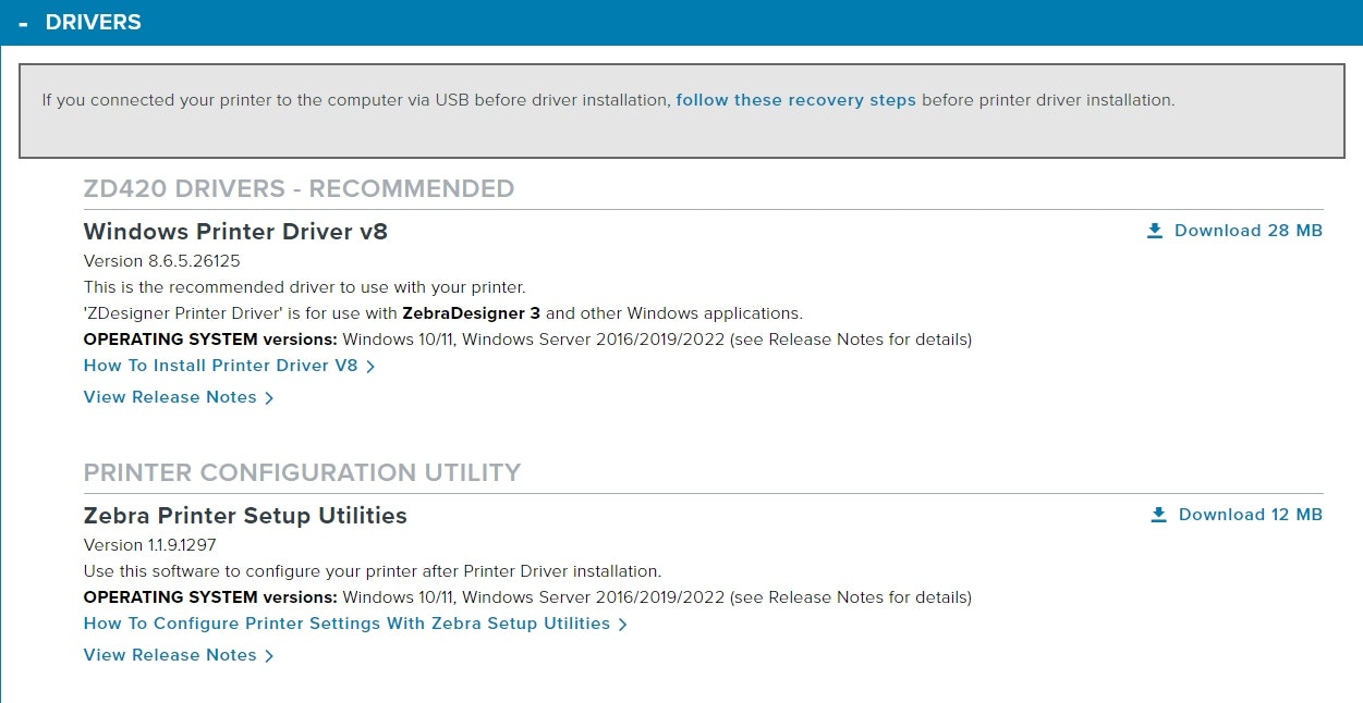 The most important pieces of setting up a Zebra printer is ensuring that you have the Zebra Print Drivers and Setup Utility properly installed on the computer. Click the link below to visit the Zebra support page, locate your printer, and install the driver and the Setup Utility program